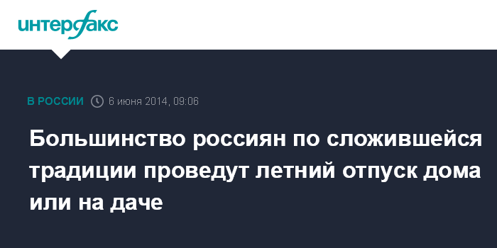 Москва. 6 июня. INTERFAX.RU - Большая часть россиян проведет свой летний отпуск дома или на даче, пытаясь отоспаться, забыть о заботах или просто расслабиться, а некоторые используют свободное время, чтобы подзаработать, выяснили социологи.