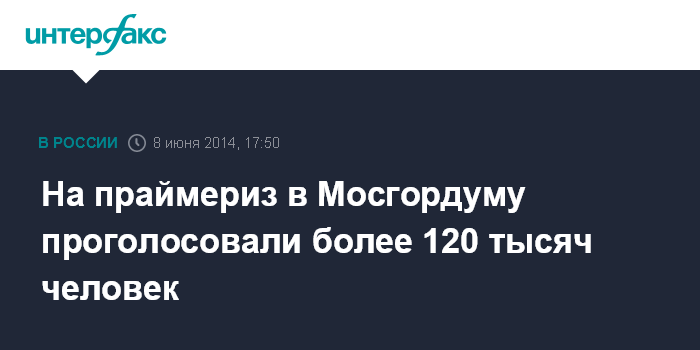 Москва. 8 июня. INTERFAX.RU - На предварительных выборах депутатов Мосгордумы, по состоянию на 14:00 мск, проголосовали более 120 тыс. москвичей, сообщил журналистам член городской счетной комиссии гражданской инициативы "Моя Москва", которая организует праймериз, Геннадий Камышников.
