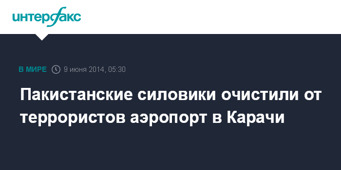 Москва. 9 июня. INTERFAX.RU - Силовые структуры Пакистана освободили от боевиков аэропорт в Карачи, сообщила газета DAWN со ссылкой на представителя армии.