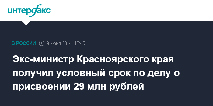 Москва. 9 июня. INTERFAX.RU - Экс-министр промышленности Красноярского края получил условный срок по делу о мошенничестве с субсидиями на 29 млн рублей.