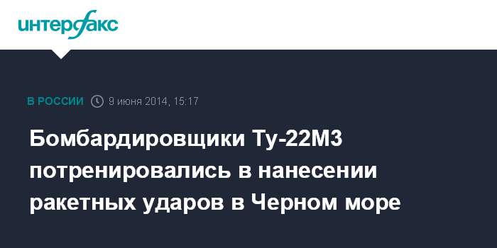 Москва. 9 июня. INTERFAX.RU - Ударная авиационная группа в составе двух бомбардировщиков Ту-22М3 дальней авиации России совместно с силами Черноморского флота отработала нанесение ракетного удара по находящимся в Черном море условным целям, сообщили "Интерфаксу" в понедельник в силовых структурах региона.