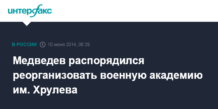 Москва. 10 июня. INTERFAX.RU - Премьер-министр РФ Дмитрий Медведев подписал распоряжение о реорганизации Военной академии материально-технического обеспечения имени генерала армии А.В.Хрулева в Санкт-Петербурге, говорится в сообщении на официальном сайте правительства РФ во вторник.