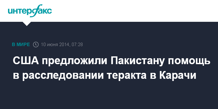 Москва. 10 июня. INTERFAX.RU - Соединенные Штаты в понедельник предложили Пакистану помощь в расследовании инцидента с нападением талибов на международный аэропорт в городе Карачи, сообщила представитель госдепартамента США Мари Харф.