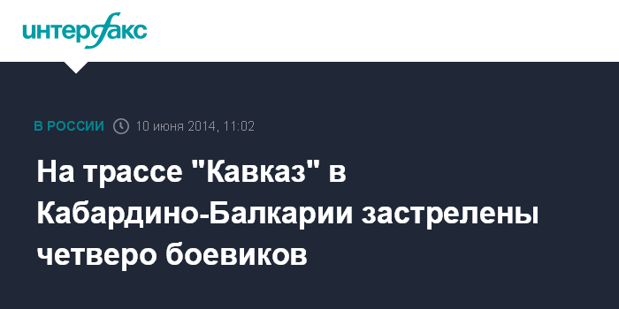 Москва. 10 июня. INTERFAX.RU - Силовики нейтрализовали четверых боевиков на федеральной трассе "Кавказ" в Кабардино-Балкарии, сообщили "Интерфаксу" в информационном центре НАК во вторник.