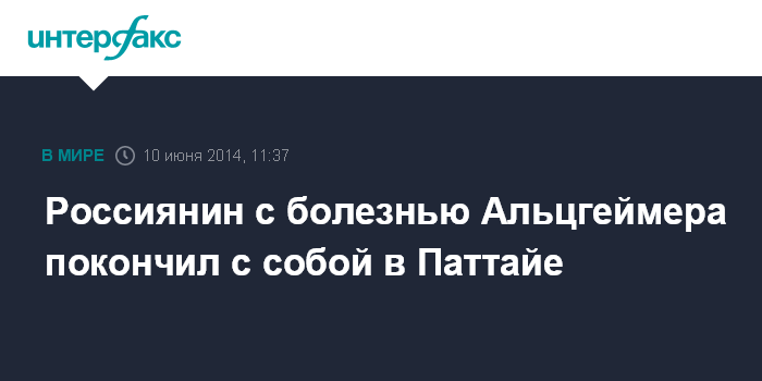Москва. 10 июня. INTERFAX.RU - 67-летний россиянин с болезнью Альцгеймера покончил с собой в Паттайе 8 июня, сообщает Pattaya People.