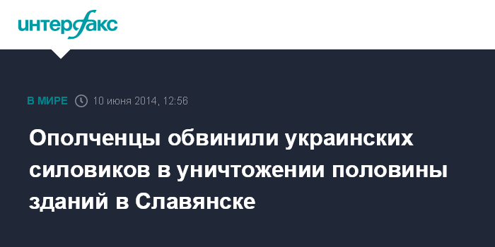 Москва. 10 июня. INTERFAX.RU - Ополченцы самопровозглашенной Донецкой народной республики заявили об уничтожении украинскими силовиками половины строений в Славянске.