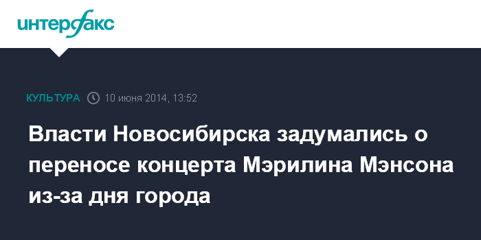 Москва. 10 июня. INTERFAX.RU - Концерт американского музыканта Мэрилина Мэнсона, запланированный на 29 июня в Новосибирске, может быть перенесен, сообщил врио новосибирского губернатора Владимир Городецкий журналистам во вторник. По его словам, такой вопрос рассматривается, "чтобы не в День города хотя бы проводить".