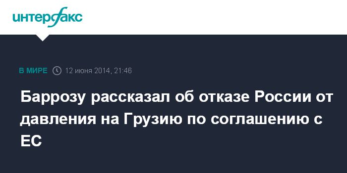 Москва. 12 июня. INTERFAX.RU - Россия не намерена оказывать какое-то давление на Грузию после подписания соглашения 27 июня об ассоциации с Евросоюзом. С таким заявлением выступил в четверг на пресс-конференции в Тбилиси председатель Еврокомиссии Жозе Мануэл Баррозу.