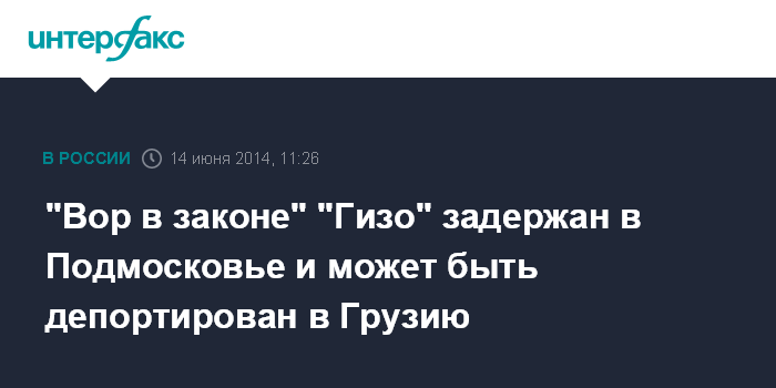 Москва. 14 июня. INTERFAX.RU - "Вор в законе" по кличке "Гизо" задержан в коттеджном поселке на территории Московской области, сообщили "Интерфаксу" в пресс-центре МВД РФ