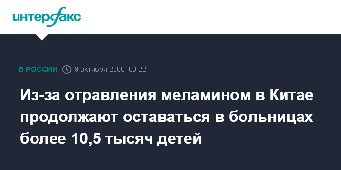 Москва. 9 октября. INTERFAX.RU - В настоящее время из-за отравления содержащимся в молочных продуктах меламином в больницах Китая продолжают проходить лечение 10 тыс. 666 детей, сообщило министерство здравоохранения КНР.