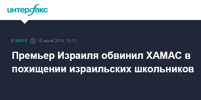Москва. 15 июня. INTERFAX.RU - Премьер-министр Израиля Биньямин Нетаньяху заявил в воскресенье, что три израильских школьника, которые пропали накануне вечером, похищены боевиками движения ХАМАС. "Сегодня я могу сказать, чего не мог сказать вчера до мощной волны арестов представителей ХАМАС", - заявил он.