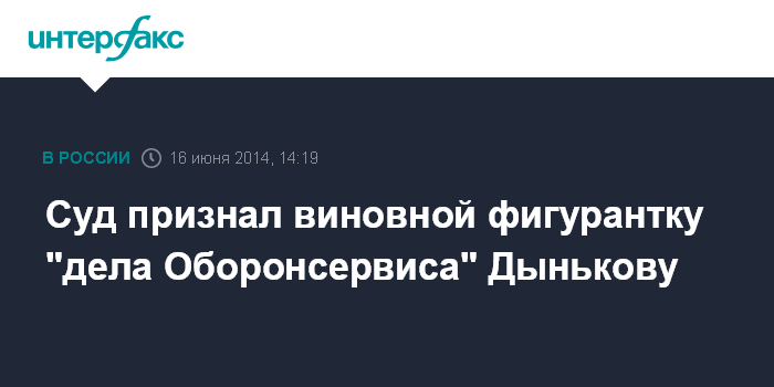 Москва. 16 июня. INTERFAX.RU - Замоскворецкий суд Москвы признал виновной фигурантку "дела Оборонсервиса", экс-главу центральной экспериментальной военно-картографической фабрики Минобороны Наталью Дынькову в причинении крупного ущерба министерству.