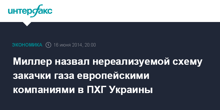 Москва. 16 июня. INTERFAX.RU - "Газпром" считает нереализуемой идею, озвученную еврокомиссаром по энергетике Гюнтером Эттингером, о том, чтобы европейские компании закачивали газ в украинские подземные хранилища газа (ПХГ) во избежание перебоев с транзитом, заявил "Интерфаксу" глава "Газпрома" Алексей Миллер.