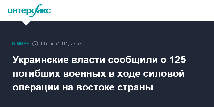 Москва. 16 июня. INTERFAX.RU - За период проведения силовой перации на территории самопровозглашенных Донецкой и Луганской народных республик погибли 125 украинских военнослужащих, сообщил первый заместитель главы правительства Украины Виталий Ярема в эфире программы "Свобода слова" на телеканале ICTV в понедельник вечером.