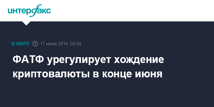 Москва. 17 июня. INTERFAX.RU - Группа разработки финансовых мер борьбы с отмыванием денег (ФАТФ) в конце июня рассмотрит документ, в котором впервые будет введено понятие виртуальной валюты, рассказал в интервью "Российской газете" руководитель проекта экспертно-информационного департамента Международного учебно-методического центра финансового мониторинга (подразделение Росфинмониторинга) Евгений Воловик.