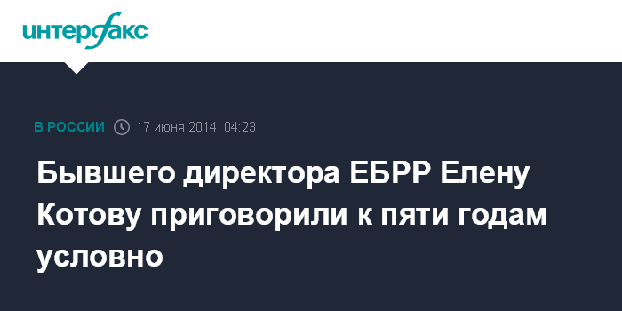 Москва. 17 июня. INTERFAX.RU - Симоновский суд Москвы приговорил экс-директора от России, Белоруссии и Таджикистана в Европейском банке реконструкции и развития (ЕБРР) Елену Котову к пяти годам лишения свободы условно, сообщает газета "Коммерсант".