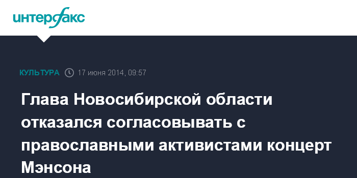 Москва. 17 июня. INTERFAX.RU - Содержательная часть всех публичных мероприятий, в том числе концерта американского музыканта Мэрилина Мэнсона в Новосибирске, должна соответствовать этическим нормам, считает врио губернатора Новосибирской области Владимир Городецкий. При этом он отметил, что не считает нужным согласовывать проведение мероприятий с православными активистами.