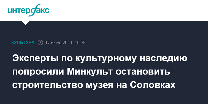 Москва. 17 июня. INTERFAX.RU - Эксперты по культурному наследию направили письмо министру культуры Владимиру Мединскому с призывом остановить строительство музейного комплекса на Соловецких островах.