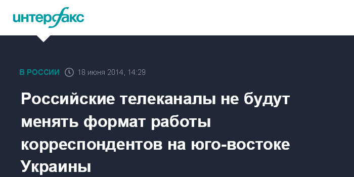 Москва. 18 июня. INTERFAX.RU - Российские телеканалы не планируют менять формат работы журналистов на Украине, съемочные группы продолжат освещать события на юго-востоке соседней страны.