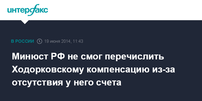 Москва. 19 июня. INTERFAX.RU - Министерство юстиции РФ не располагает сведениями о реквизитах банковского счета бывшего главы НК "ЮКОС" Михаила Ходорковского для перечисления ему компенсации в 10 тыс. евро, предписанной Европейским судом по правам человека.