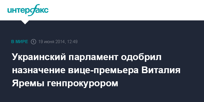 Москва. 19 июня. INTERFAX.RU - Верховная рада одобрила назначение первого вице-премьера Виталия Яремы генеральным прокурором Украины.