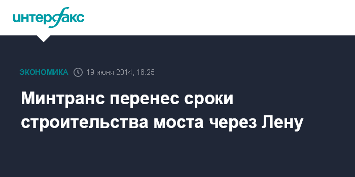 Москва. 19 июня. INTERFAX.RU - Министерство транспорта РФ приняло решение о переносе сроков строительства моста через Лену. "Да, принято (решение). Этот мост будет, но попозже. Сроки сдвинуты", - сообщил заместитель министра транспорта РФ Сергей Аристов журналистам в четверг в кулуарах Петербургского международного юридического форума.