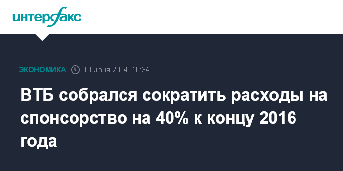 Москва. 19 июня. INTERFAX.RU - ВТБ планирует сократить расходы на спонсорство на 40% к концу 2016 года, сообщил первый зампред ВТБ Василий Титов журналистам перед началом годового собрания акционеров банка.
