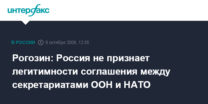 Москва. 9 октября. INTERFAX.RU - Постпред России при НАТО Дмитрий Рогозин заявил, что Россия считает нелегитимным соглашение о сотрудничестве, подписанное ОН и НАТО, и утверждает, что генсек НАТО в данном случае превысил свои полномочия. "РФ как постоянный член Совета безопасности считает данное соглашение нелегитимным", - сказал "Интерфаксу" в четверг Д.Рогозин, комментируя факт подписания соглашения между секретариатами ООН и НАТО от 23 сентября.