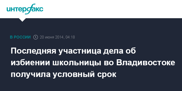 Москва. 20 июня. INTERFAX.RU - Фрунзенский суд Владивостока приговорил последнюю участницу резонансного дела об избиении школьницы сверстницами, вымогавшими у нее 5 тысяч рублей, к двум годам лишения свободы условно.