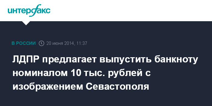 Москва. 20 июня. INTERFAX.RU - Фракция ЛДПР предлагает выпустить новую купюру номиналом в 10 тысяч рублей, посвященную воссоединению Крыма и Севастополя с Российской Федерацией.
