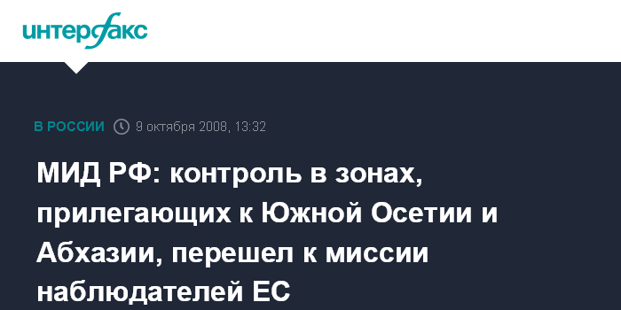 Москва. 9 октября. INTERFAX.RU - МИД России заявляет, что с 9 октября контроль за безопасностью в зонах Грузии, прилегающих к Южной Осетии и Абхазии, перешел к миссии ЕС в Грузии.