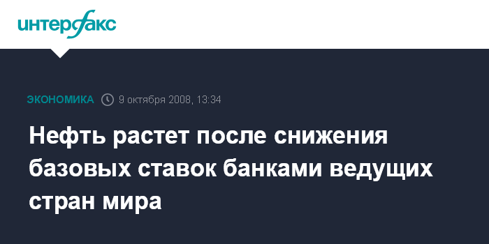 Москва. 9 октября. INTERFAX.RU - Нефть растет после снижения базовых ставок банками ведущих стран мира, сообщило агентство Bloomberg.