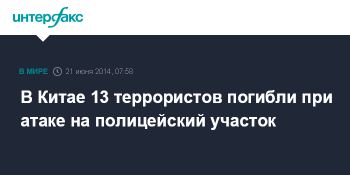 Москва. 21 июня. INTERFAX.RU - Полиция убила 13 террористов, атаковавших в субботу полицейский участок в Синьцзяне, сообщило агентство Associated Press.