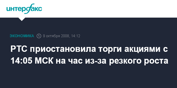 Москва. 9 октября. INTERFAX.RU - Фондовая биржа РТС приостановила в четверг торги акциями с 14:05 МСК на час из-за роста технического индекса к уровню предыдущего дня более чем на 5%, сообщила биржа.