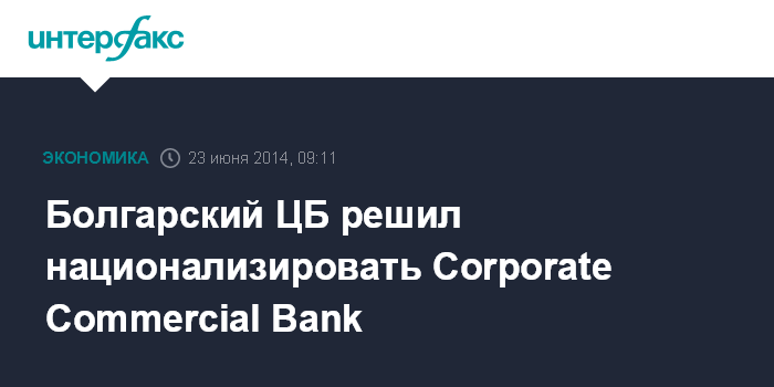 Москва. 23 июня. INTERFAX.RU - Центральный банк Болгарии в воскресенье объявил о национализации Corporate Commercial Bank, четвертого крупнейшего по активам банка страны, сообщает Financial Times.