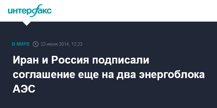 Москва. 23 июня. INTERFAX.RU - Иран и Россия подписали соглашение на сооружение двух энергоблоков АЭС, передает иранское новостное агентство Mehr со ссылкой на официального представителя Организации по атомной энергии Ирана Бехруза Камалванди.