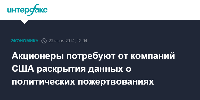 Москва. 23 июня. INTERFAX.RU - Все больше акционеров требуют от американских компаний раскрытия данных о пожертвованиях на политические цели: годовые собрания акционеров превращаются в еще одну арену предвыборных баталий, пишет Financial Times.