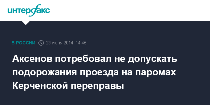 Москва. 23 июня. INTERFAX.RU - И.о. главы Крыма Сергей Аксенов требует от компаний, которые занимаются морскими перевозками грузов и пассажиров между Крымом и Краснодарским краем, не допускать необоснованного повышения стоимости проезда на паромах Керченской переправы и других видах морского транспорта.