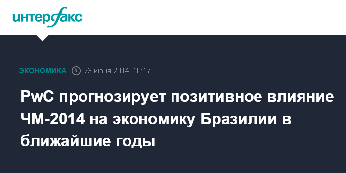 Москва. 23 июня. INTERFAX.RU - Чемпионат мира по футболу привлечет всеобщее внимание к экономике Бразилии, хотя прямое его влияние на экономическую ситуацию в стране будет сравнительно небольшим, говорится в июньском обзоре мировой экономики PricewaterhouseCoopers (PwC).
