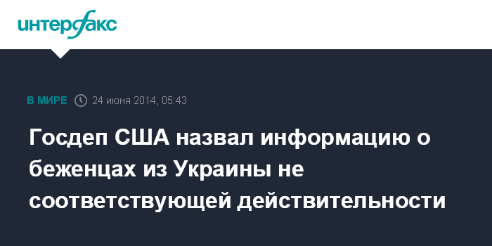 Москва. 24 июня. INTERFAX.RU - Представитель госдепартамента США Мари Харф считает, что сообщения о потоке беженцев с Юго-Востока Украины не соответствуют действительности.