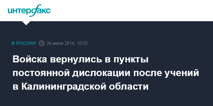 Москва. 24 июня. INTERFAX.RU - Войска и силы, участвовавшие в учениях на территории Калининградской области, вернулись в пункты постоянной дислокации и приступили к плановой боевой учебе, сообщили "Интерфаксу" во вторник в пресс-службе Западного военного округа.