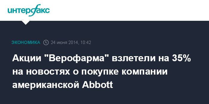 Москва. 24 июня. INTERFAX.RU - Акции "Верофарма" утром во вторник взлетели на 35% на новостях, что американская фармацевтическая компания Abbott покупает у основного совладельца "Верофарма" Романа Авдеева его долю в компании за 13,6-17 млрд рублей ($395-495 млн), то есть с существенной премией к рынку.