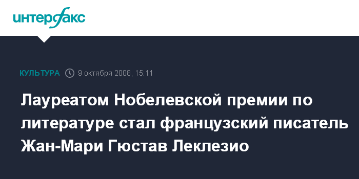 Москва.9 октября. INTERFAX.RU - Французский писатель Жан-Мари Гюстав Леклезио стал лауреатом Нобелевской премии по литературе 2008 года, сообщил в четверг Нобелевский комитет в Стокгольме.