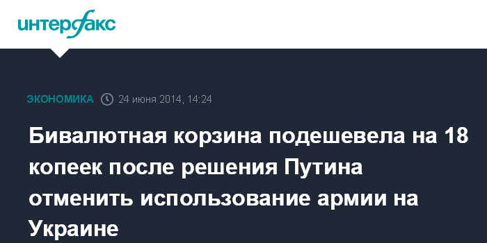 Москва. 24 июня. INTERFAX.RU - Рубль заметно укрепился к доллару и евро на торгах Московской биржи, бивалютная корзина снизилась на 18 копеек - до 39,39 рубля на новости о решении президента России Владимира Путина отменить использование вооруженных сил на Украине.