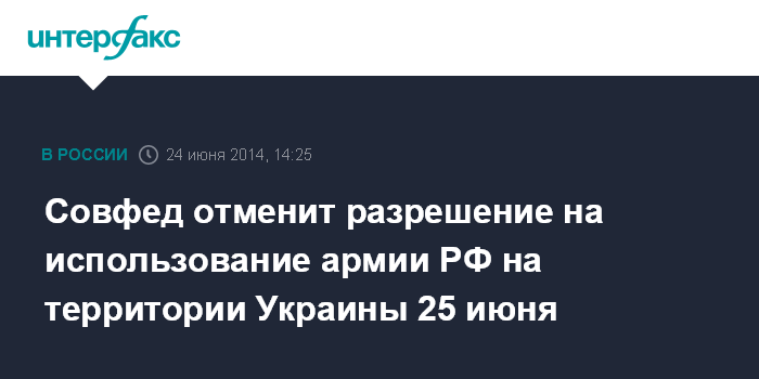 Москва. 24 июня. INTERFAX.RU - Совет Федерации на заседании в среду, 25 июня, поддержит решение президента РФ Владимира Путина об отзыве согласия, данного верхней палатой, на использование вооруженных сил РФ на территории Украины, сообщил во вторник "Интерфаксу" замглавы комитета по международным делам верхней палаты Андрей Климов.