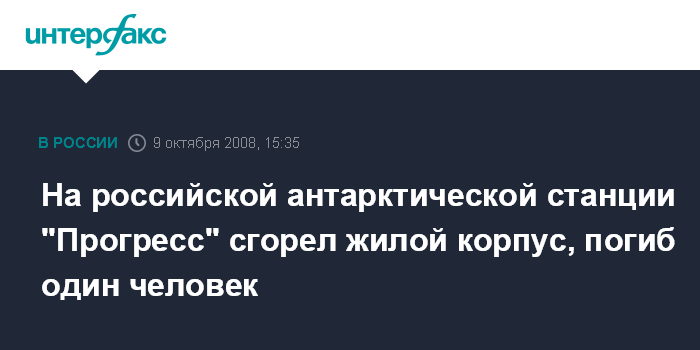 Москва.9 октября. INTERFAX.RU - Hа российской антарктической станции "Прогресс" сгорел жилой корпус, один человек погиб и двое пострадали, сообщили "Интерфаксу" в четверг в Арктическом и Антарктическом институте.