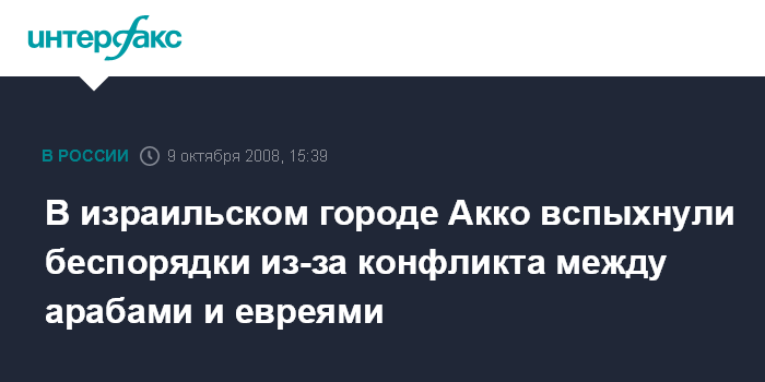 Москва.9 октября. INTERFAX.RU - В городе Акко, расположенном на севере Израиля, вспыхнули столкновения между арабами и евреями, сообщает интернет-сайт израильской газеты "Гаарец".