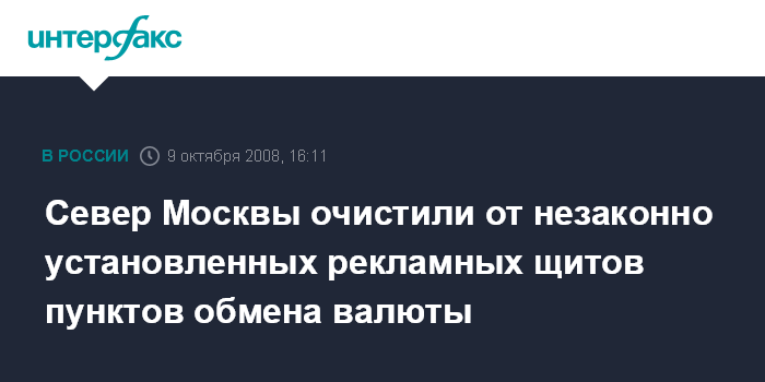 Москва.9 октября. INTERFAX.RU - В ходе мероприятий по ликвидации незаконной рекламы на севере столицы выявлено и убрано около 130 самовольно установленных щитов пунктов обмена валюты, сообщил "Интерфаксу" префект Северного округа Юрий Хардиков в четверг.