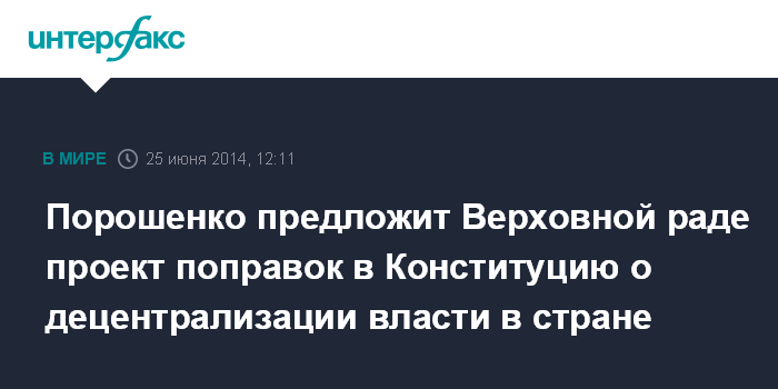 Москва. 25 июня. INTERFAX.RU - Президент Украины Петр Порошенко заявил, что проект изменений в Конституцию, касающихся децентрализации власти, будет внесен в Верховную Раду 26 июня.