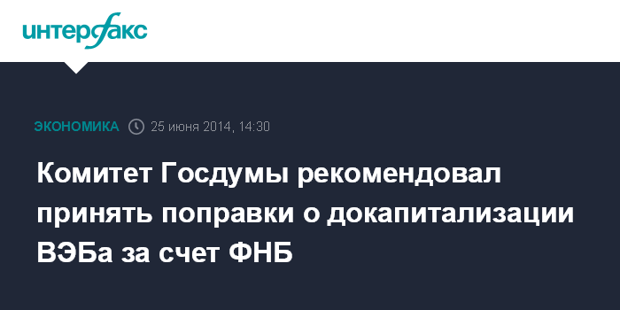 Москва. 25 июня. INTERFAX.RU - Комитет Госдумы по финансовому рынку на заседании в среду рекомендовал нижней палате парламента принять во втором чтении и в целом поправки в закон о банке развития, касающиеся докапитализации Внешэкономбанка (ВЭБа).